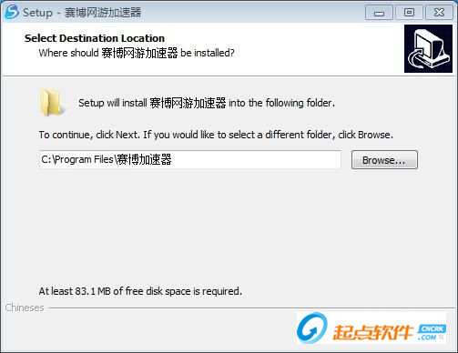 我們進(jìn)入到賽博網(wǎng)游加速器安裝向?qū)А0惭b向?qū)?huì)引導(dǎo)我們完成賽博網(wǎng)游加速器的安裝。首先我們需要確定賽博網(wǎng)游加速器的安裝路徑,安裝程序有默認(rèn)的安裝路徑:C:\Program Files\賽博加速器,安裝賽博網(wǎng)游加速器需要83.1MB的磁盤空間;點(diǎn)擊Next下一步繼續(xù)安裝進(jìn)程;