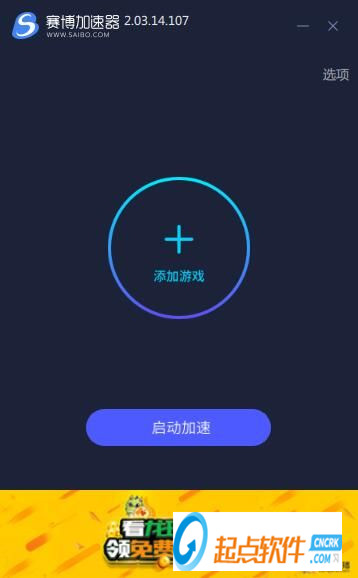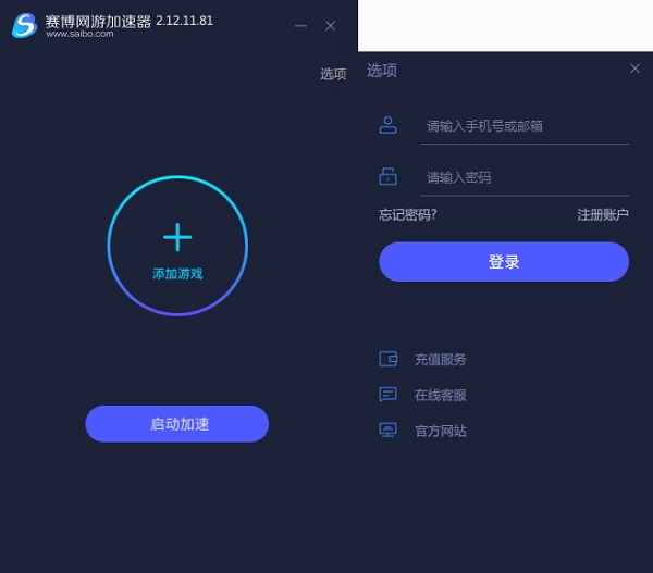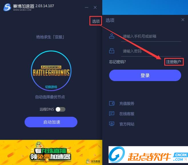 點(diǎn)擊賽博網(wǎng)游加速器主界面中的選項(xiàng),在選項(xiàng)窗口中點(diǎn)擊注冊賬戶;