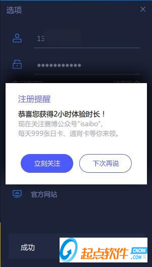 注冊成功,賽博網(wǎng)游加速器提示我獲得了2小時(shí)體驗(yàn)時(shí)長。關(guān)注賽博網(wǎng)游加速器公眾號(hào)還可以領(lǐng)取日卡、通宵卡等福利;