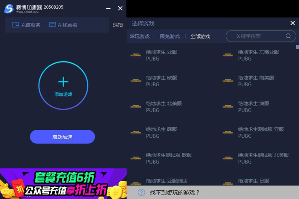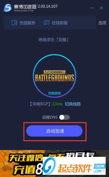 回到賽博網(wǎng)游加速器界面,我們就可以加速絕地求生游戲了。點(diǎn)擊啟動(dòng)加速,等賽博網(wǎng)游加速器完成加速后就可以玩亞服的絕地求生了。