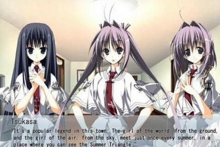 那是在世界本身的少女與天空的少女邂逅的地方才能開始實(shí)現(xiàn)的橫跨天河的vega與Altair,被稱為織女星與牛郎星的兩顆星星,再加上北十字星的頂之星deneb,被稱為夏季大三角。 那是形容三位一體的圣之圖形。