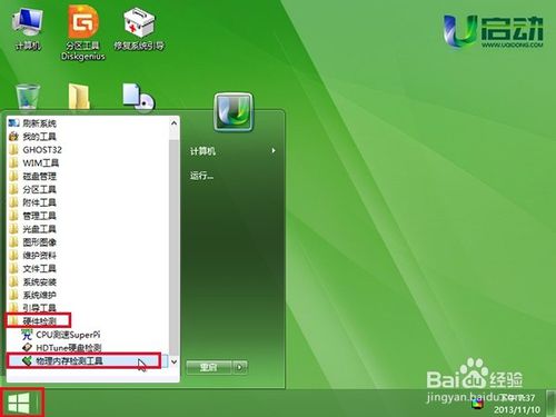 進(jìn)入到u啟動(dòng)win8pe系統(tǒng)桌面后,點(diǎn)擊桌面左下角“windows圖標(biāo)——硬件檢測(cè)——物理內(nèi)存檢測(cè)工具”,如下圖所示: