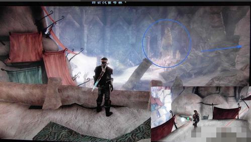 2.先找到圖中藍框的建筑,然后順著它旁邊的小路來到一房頂,一路跳下去就找到鑰匙。