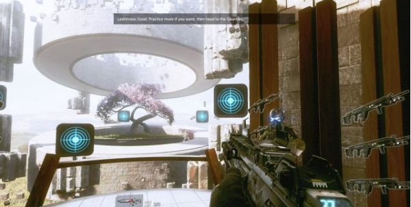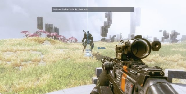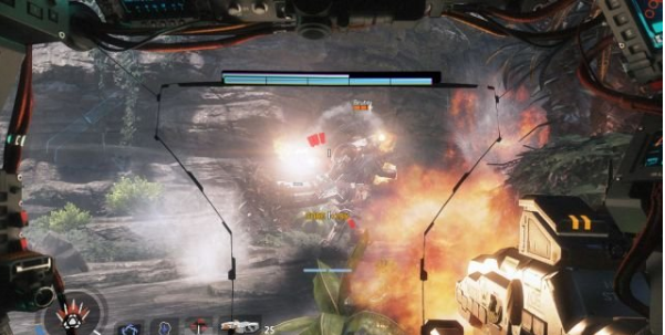 最后一個(gè)練習(xí)就是召喚泰坦,瞄準(zhǔn)IMC的一臺(tái)泰坦,然后按V鍵就可以讓泰坦砸毀敵人的泰坦。