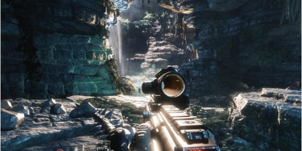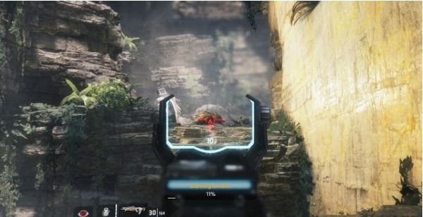 step6.進(jìn)入到山谷內(nèi),注意巖洞上會(huì)出現(xiàn)無(wú)人機(jī),兩三槍就可以將它們擊落。