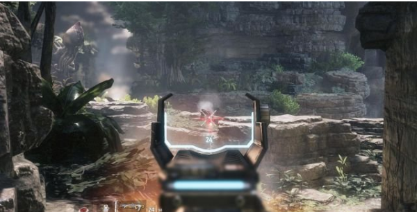 step15.首先要學(xué)習(xí)一些泰坦的操作,摁住鼠標(biāo)滑輪使用漩渦盾,吸住敵人的子彈,瞄準(zhǔn)山上的機(jī)械兵,松開(kāi)鼠標(biāo)滑輪就可以將它們的子彈反彈回去。