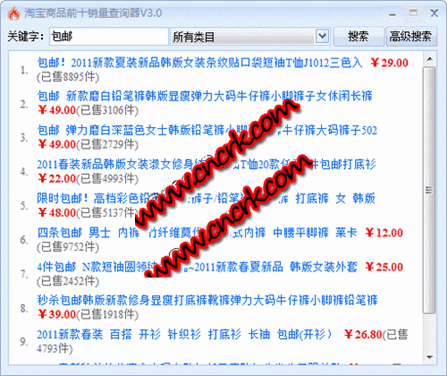 淘寶商品前十銷量查詢器可以查詢淘寶網(wǎng)各類銷量前十的商品,比前一版增加了高級搜索,高級搜索可以按照多種方式查詢,搜索出來的信息比淘寶網(wǎng)搜索引擎搜索出的信息更加全面,可以使買家更容易貨比三家。