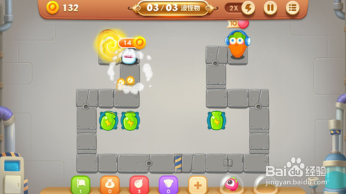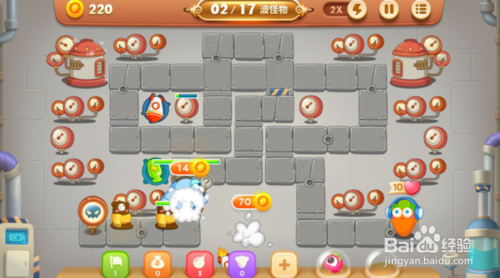 接下來我們的目標(biāo)不僅是怪物,還有將上方中間的障礙物都清除掉,在毒氣瓶附近轉(zhuǎn)折處再放一個忍者鏢,升滿級。之后就是將大金庫清除出來,這樣我們就有很多錢了。在清除的金庫處有雪花,忍者鏢,毒氣瓶和冰凍星升滿級。
