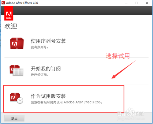 這是安裝界面,會(huì)有三個(gè)選項(xiàng),我們選擇最后一個(gè)試用安裝即可,后面我們會(huì)講解如何永久破解。