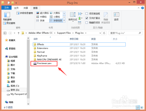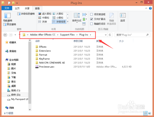 接下來我們要找到After Effects的插件目錄,我安裝的是Adobe After Effects CC綠色版,在D盤:D:\Program Files\Adobe CS6\Adobe After Effects CC\目錄下: