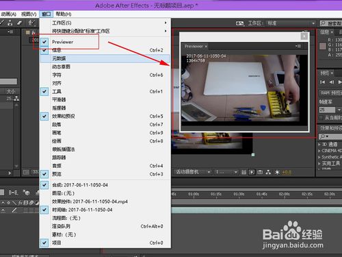 如果你已經(jīng)運(yùn)行了AE,需關(guān)閉后重新啟動(dòng),啟動(dòng)后點(diǎn)擊菜單欄中的窗口選項(xiàng)即可看到剛剛安裝的Previewer程序。