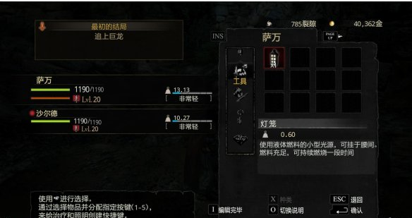 游戲開始,主角旁邊還有一名叫做沙爾德的隨從。按I打開物品欄,在工具欄可以找到一盞燈籠,將其點燃之后開始征途。