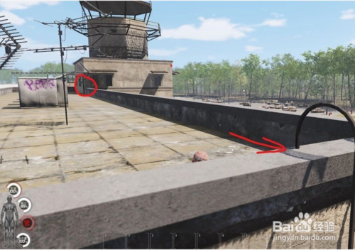 如果想繼續(xù)搜,就可以到西邊的幾個連體樓那里,先搜一個樓,搜完一個就從樓頂直接爬樓梯到另一個樓,注意高度,不要強(qiáng)行跳過去,這里的建筑都是可以互相穿過的,可以看下圖的位置進(jìn)去換樓,如果這些樓都搜完了,也可以從樓上直接下去,沿著西邊的路直接就能跑出去。