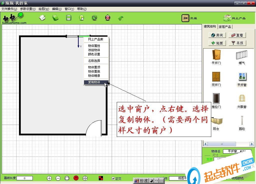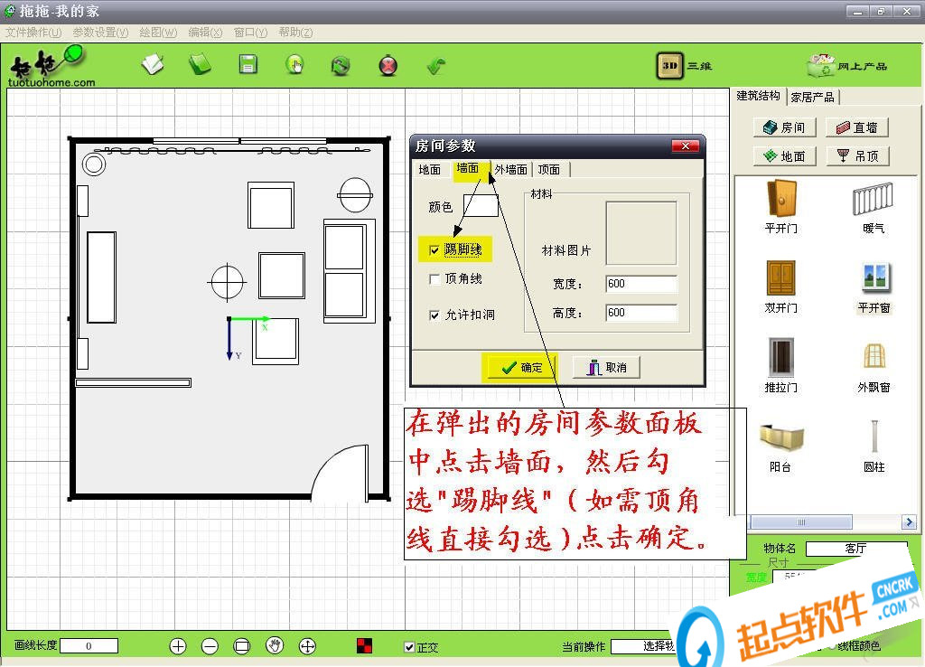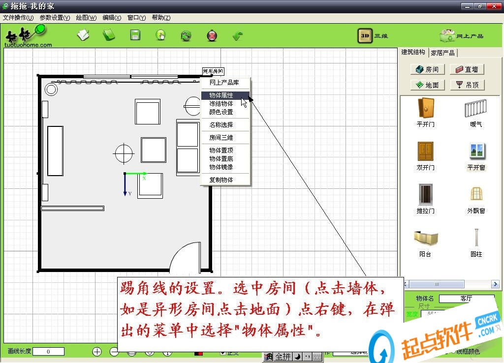 設(shè)置踢角線(如果是矩形房間選中墻體點右鍵從物體屬性里編輯。如果是異形房間需選地面點右鍵從物體屬性里編輯)