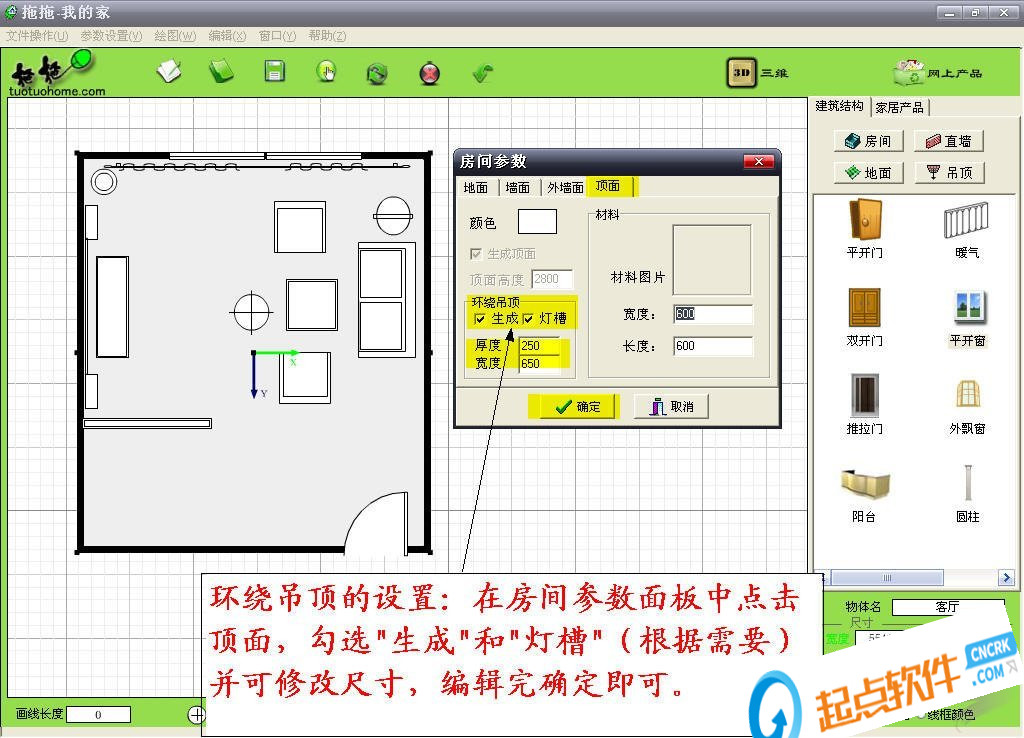 設(shè)置環(huán)繞吊頂(可根據(jù)需要勾選燈槽)這里我們按默認(rèn)的尺寸生成。