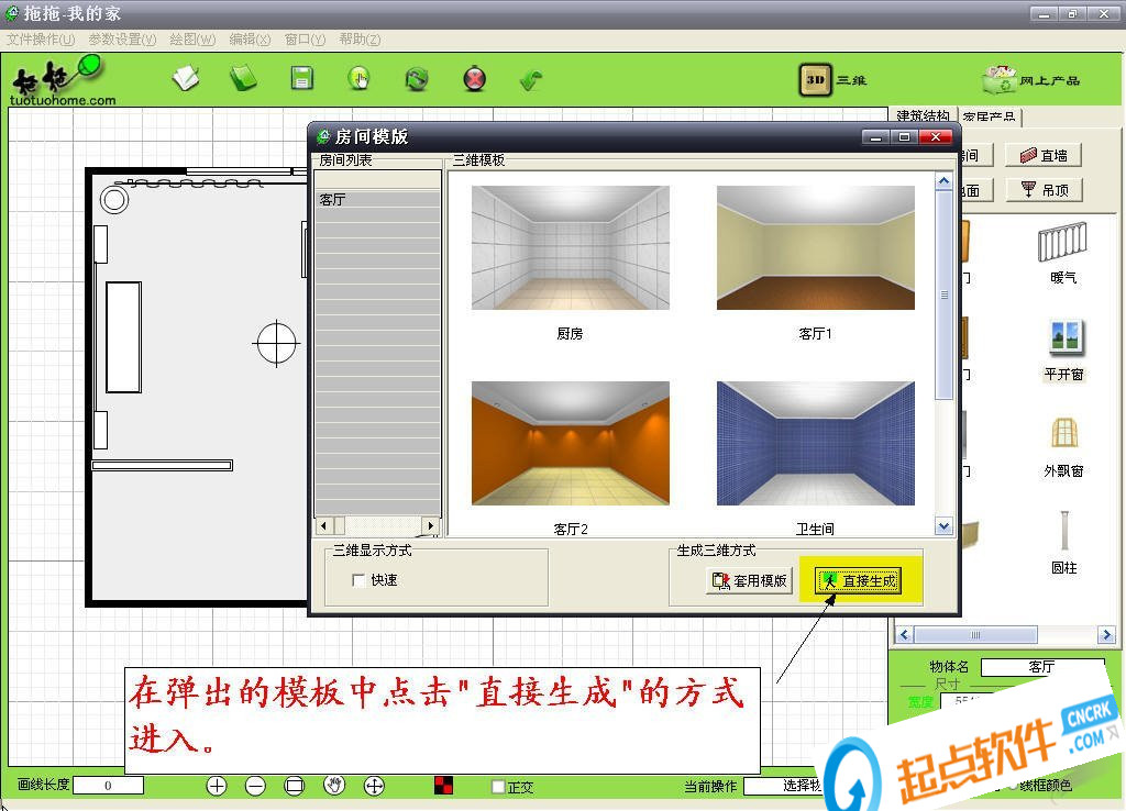 在進(jìn)入三維時有幾種方式(多房間時勾選快速??呻p擊房間圖片套用模板方式生成的頂面、墻面與地面材料與模板中的相同)