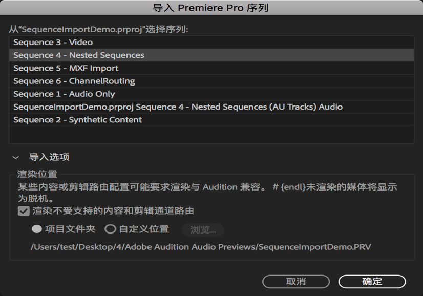 2、“導(dǎo)入 Premiere Pro 序列”對(duì)話(huà)框即會(huì)打開(kāi),并顯示項(xiàng)目包含的序列列表。您可以選擇要打開(kāi)的特定序列。通過(guò)引用原始媒體直接導(dǎo)入選定的序列。