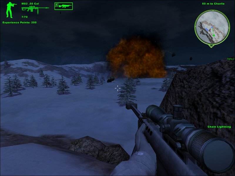 暴風雪夜戰(zhàn)。本關天氣非常不好,基地外根本看不見敵人,相反敵人看我們倒是非常清楚。一上來山谷對面有2支巡邏隊,滅掉,穿過山谷從山谷左邊向敵基地前進,路上消滅4個守衛(wèi),從基地左側逐步推進,這時隊友們會開始進攻,多利用隊友火力。消滅2個基地內敵人的有生力量。在主基地,敵人正準備用幾架直升機把核設施運走,用火箭把直升機掉,最后用槍把核設施毀掉,過關。本關受天氣影響嚴重,能見度很低,很多時候只能依靠敵人開火時候瞬間的閃光確定對方位置,建議用M4或M82,難度4星。