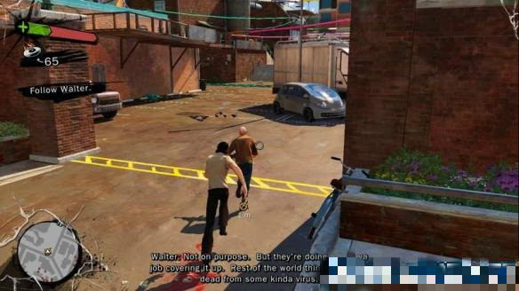 利用上空的繩索滑行以及剛拿到的手槍可以一槍一個暴徒。干掉暴徒后與Floyd再次對話,任務(wù)結(jié)束。