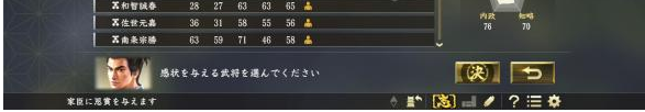 因?yàn)閿撤絼?shì)力也會(huì)進(jìn)行調(diào)略,因此玩家可透過賜予家臣“傳家寶”以及作為“恩賞”的“戰(zhàn)功獎(jiǎng)狀”提高忠誠(chéng)度進(jìn)行防范。玩家可以向很少來訪的商人購(gòu)買傳家寶,或利用攻陷據(jù)點(diǎn)后可以頒發(fā)的“戰(zhàn)功獎(jiǎng)狀”來替代昂貴的傳家寶。賜予的時(shí)機(jī)、對(duì)象、與內(nèi)容將會(huì)是掌握人心的關(guān)鍵。