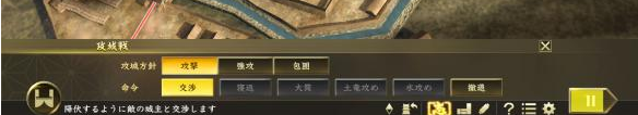 本作全新追加的“攻城戰(zhàn)”中,除了以武力攻下天守之外,也能透過“城主交涉”進(jìn)行勝負(fù)。攻城方可對(duì)守城方城主進(jìn)行交涉,而交涉成功后不只可使守城方交出據(jù)點(diǎn),還能使敵方將領(lǐng)投降,將傷害降至最低。不論是發(fā)揮兵力進(jìn)行武力壓制,或是采取巧妙交涉進(jìn)行攻城,能使用豐富戰(zhàn)術(shù)享受攻城戰(zhàn)的樂趣。