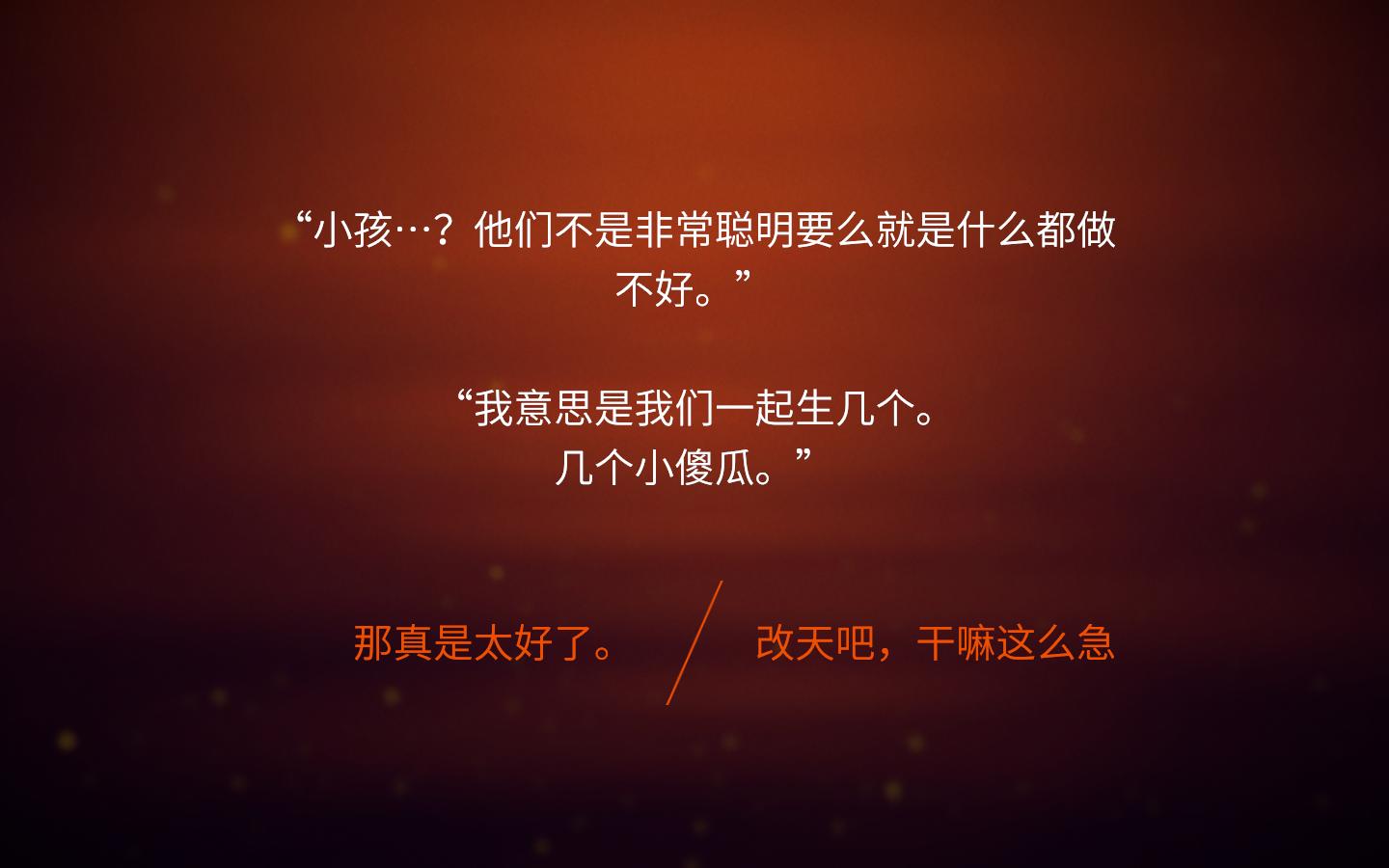 這一天亨利被Delilah從睡夢中喚醒。Delilah提示他看向窗外——森林火災正在發(fā)生,并且這很可能是今年最大的一場火災。這里亨利可以給這場火災取一個名字,根據(jù)自己的喜好來就好。之后Delilah會跟亨利聊一些較為曖昧的話題,在游戲的氣氛之中,還是比較吸引人的。根據(jù)自己想選擇的選項來進行游戲吧。