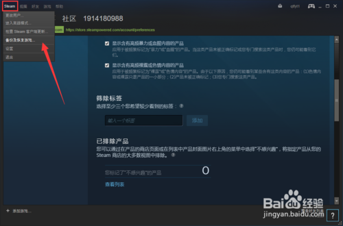 點擊左上角的steam,可以恢復備份你的游戲,如下圖所示