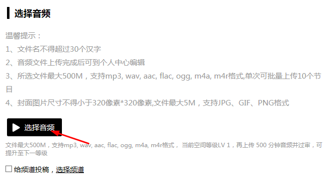 了解投稿要求,就可以通過點(diǎn)擊“選擇音頻”進(jìn)行投稿了。