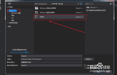2、選取Visual C++,創(chuàng)建一個空項目