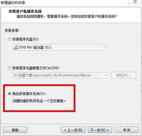 2.在此處,選擇第三個(gè)也就是稍后安裝操作系統(tǒng)的選項(xiàng)。這里小編不建議使用常規(guī)的第二個(gè)選項(xiàng),用第二個(gè)的時(shí)候 VMware Workstation會(huì)自己識(shí)別系統(tǒng)然后默認(rèn)使用簡(jiǎn)易安裝。雖然這樣省去一些操作但親測(cè)會(huì)將系統(tǒng)語(yǔ)言弄成英文不好改回來(lái),并且如果你是實(shí)機(jī)安裝也不會(huì)有簡(jiǎn)易安裝這玩意兒。建議還是老老實(shí)實(shí)安裝,所以選擇第三個(gè)選項(xiàng)。