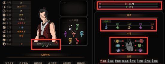 左方43歲,說明人物當(dāng)前的歲數(shù),歲數(shù)下方25/25,說明剩余壽命。總壽命=43+25=68年。內(nèi)外傷不治療、內(nèi)息過高、中毒久不醫(yī)都會帶來余下壽命的縮減,極端出現(xiàn)1/25的情況,這個時候表示你的壽命只有43+1=44。壽命決定了一個角色正?;顒拥淖罡邥r限,因?yàn)閯?wù)必注意人物總壽命和余下的壽命