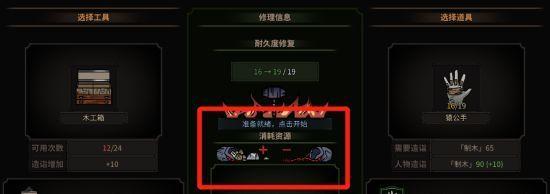 裝備制作和維修:維修和制作的邏輯一直,在界面中左邊放工具,右邊放核心物件,中間就要投放資源,才能執(zhí)行操作(見下圖的紅框,我以維修木裝備為例)
