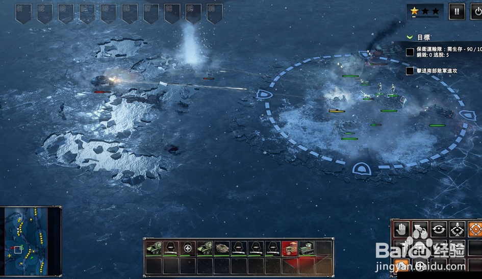 第二種是逃跑流,游戲中系統(tǒng)會(huì)設(shè)定一定數(shù)目的運(yùn)輸車(chē)通過(guò)指定區(qū)域,比如蘇軍第一場(chǎng)就是運(yùn)用運(yùn)輸車(chē)通過(guò)冰面將物資運(yùn)輸?shù)匠莾?nèi),確保城池當(dāng)中的軍隊(duì)不至于餓死。