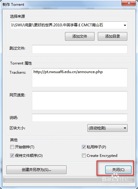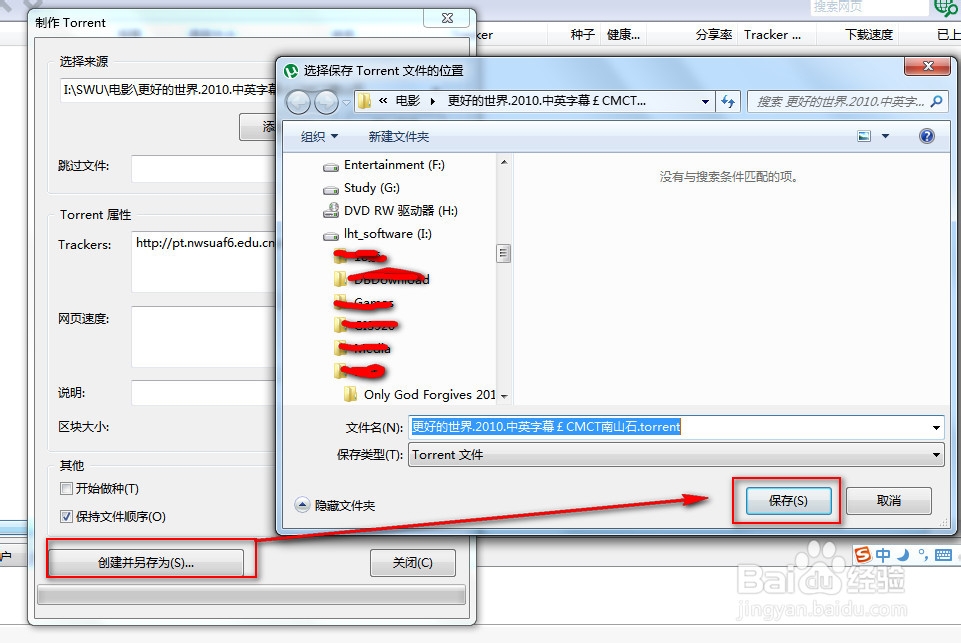 將tracker復(fù)制到utorrent的tracker屬性內(nèi)!其他信息不用管,一般默認(rèn)(具體每個PT站要求可能不一樣)。填寫好后,【點擊創(chuàng)建另存為】,保存種子存放路徑。步驟如下圖: