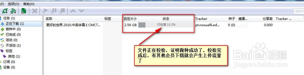點擊確定后,會看到文件正在校檢,校檢完成后種子資源發(fā)布就成功了。只要等待,如果你的資源很火,就會馬上有人下載,有人下載就會上傳流量了。