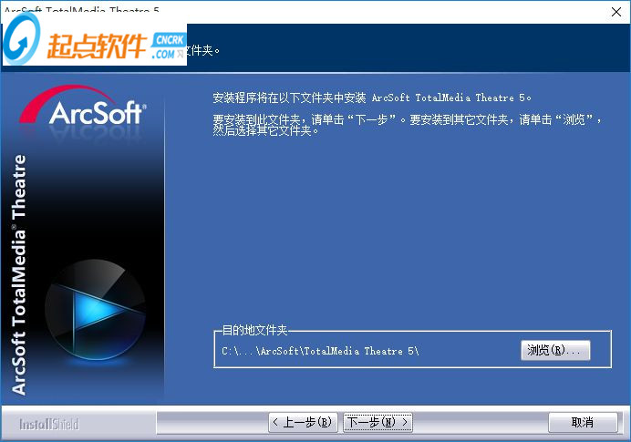 4、對(duì)目的地位置進(jìn)行快速的選擇,默認(rèn)位置“C:\Program Files (x86)\ArcSoft\TotalMedia Theatre 5”,建議安裝在D盤,點(diǎn)擊下一步;