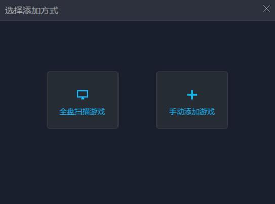 點(diǎn)擊“添加游戲”后就會(huì)彈出的一個(gè)窗口,在這個(gè)彈框中我們可以看到有兩種添加方式,一個(gè)是“全盤掃描游戲”,一個(gè)是“手動(dòng)添加游戲”;