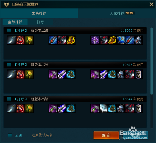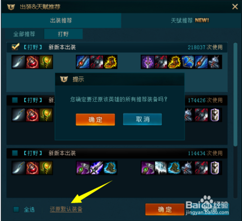 當(dāng)然,如果我們希望“還原系統(tǒng)默認(rèn)”出裝,則只需要在此窗口中點(diǎn)擊“還原默認(rèn)裝備”按鈕即可。