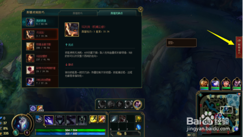 點(diǎn)擊LOL游戲界面右側(cè)的“對(duì)局技巧”按鈕,就可以查看當(dāng)前游戲中自己的英雄和短文所有英雄的“英雄技巧”和“英雄優(yōu)缺點(diǎn)”。以實(shí)現(xiàn)知已知彼,百戰(zhàn)不怠的對(duì)戰(zhàn)策略。