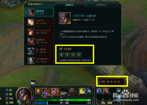 要想玩好一個(gè)英雄,熟悉并掌握其“技能連招”是獲取勝利的前題和基礎(chǔ)。對(duì)此LOL助手在游戲界面中提示“技能連招”,如圖所示: