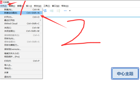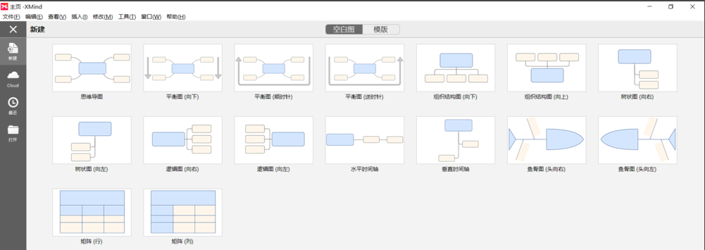 2、進入XMind軟件界面截圖如下,默認(rèn)自動創(chuàng)建一個新圖,同時默認(rèn)選擇“空白的”模板。