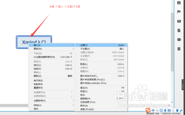 5、如何添加分支? 右擊“XMind軟件分享”出現(xiàn)功能菜單-插入-主題、子主題等,如點擊“子主題”。