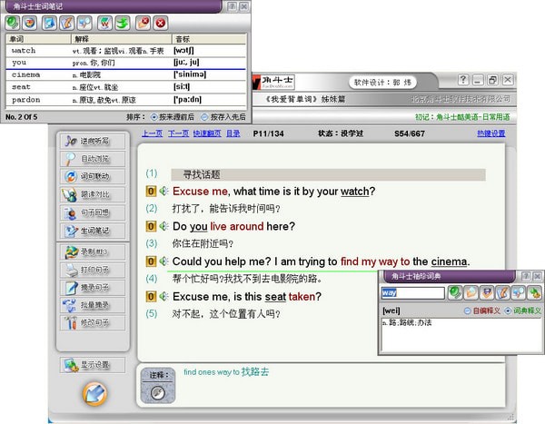 - 1,600多句時尚超酷情景美語(美籍外教錄音)我公司聘請美籍外教精心編輯的口語教材,全面、時新、地道,包含一些其他口語教材一般沒有的 Internet、電信等話題,涵蓋了工作生活的各個方面,包括飲食、起居、購物、交通、求職、住宿、教育、娛樂、體育、旅游、因特網、態(tài)度、心情等100多個生活中的分類情景。另外與眾不同的是,本軟件特別精編了200多句典型語法例句,背熟這些句子就等于掌握了語法,再也不會犯中國人說英語常見的時態(tài)、單復數、虛擬語氣等方面的錯誤了!
