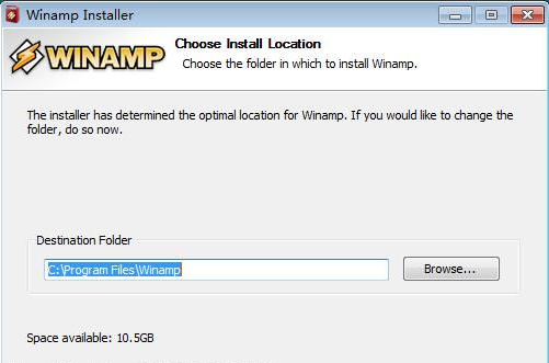安裝向?qū)J(rèn)設(shè)置的軟件安裝路徑為C:\Program Files\Winamp。點(diǎn)擊Browse瀏覽可以在文件夾瀏覽窗口中自定義設(shè)置軟件安裝路徑;