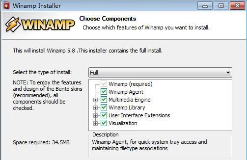 選擇Winamp的安裝組件。我們可以選擇Winamp (required)