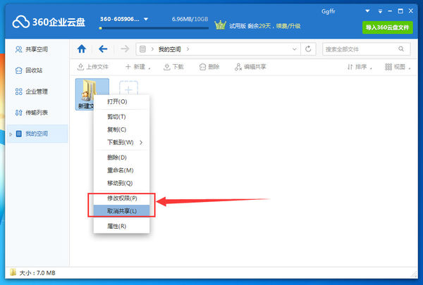 另外如果想要修改權限或者取消共享,那就在“我的空間”中找到該文件,接著用鼠標右鍵點擊它就可以看到“修改權限”和“取消功能”的功能了。