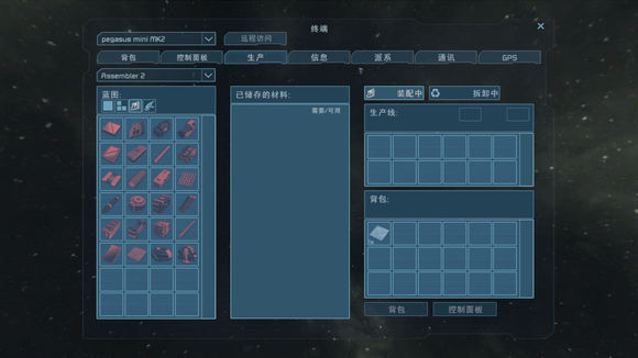 這里是生產(chǎn)菜單,生產(chǎn)建造方塊必要的零件需要在這里下單(請(qǐng)確??臻g站中有裝配機(jī)且物資充足,否則無(wú)法進(jìn)行生產(chǎn))。點(diǎn)擊左側(cè)進(jìn)行下單,單擊一次生產(chǎn)一個(gè),按CTRL+單擊生產(chǎn)10個(gè),SHIFT+單擊生產(chǎn)100個(gè)。要生產(chǎn)工具請(qǐng)點(diǎn)擊左上角四個(gè)小圖標(biāo)中最右側(cè)的圖標(biāo)。如果只想要生產(chǎn)建造某方塊所需的零件請(qǐng)點(diǎn)擊左上角四個(gè)小圖標(biāo)中的左一(大船方塊)和左二(小船方塊)。如果想取消請(qǐng)雙擊右邊已經(jīng)下好的訂單。同時(shí)裝配機(jī)也支持拆卸零件和工具,只要點(diǎn)擊右上的“拆卸中”按鈕,之后的操作方式和生產(chǎn)相同。