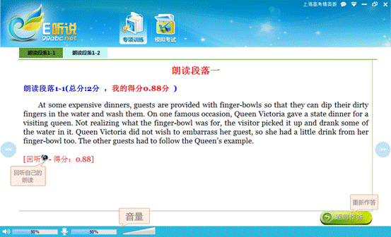 一、系統(tǒng)頁面上各按鈕功能軟件包含專項(xiàng)訓(xùn)練和模擬考試兩大模塊。專項(xiàng)訓(xùn)練模式有助于學(xué)生對(duì)自己薄弱環(huán)節(jié)進(jìn)行強(qiáng)化練習(xí);模擬考試模式,完全按照聽說測試考試流程進(jìn)行。