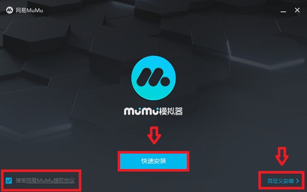 下載網(wǎng)易mumu模擬器安裝包,點擊安裝包打開安裝界面,點擊【快速安裝】按鈕即可安裝。