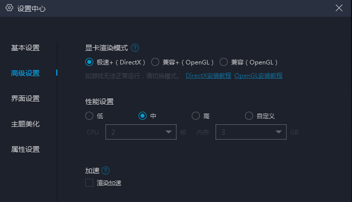 5、查看模擬器右上角“設置中心”——“高級設置”,顯卡渲染模式是否選擇了極速+,若極速+是灰色的,則切換為極速模式后重啟即可。